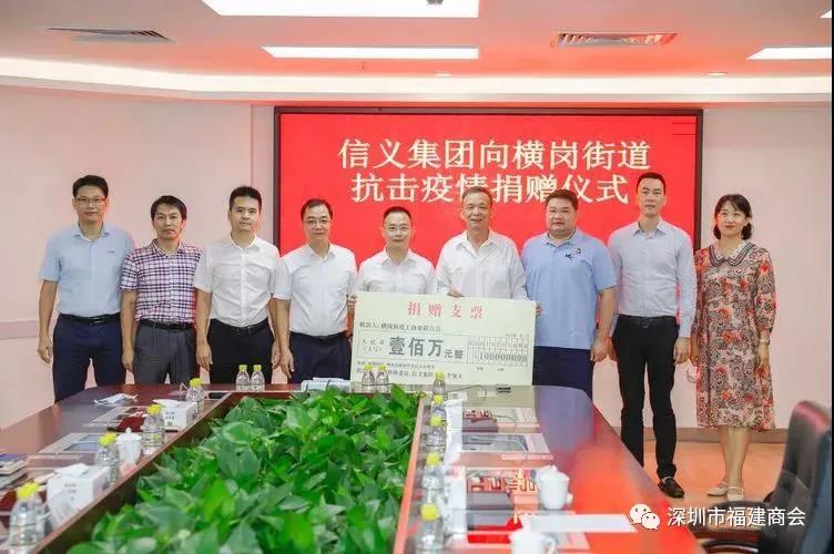 6月29日上午,全国政协委员、深圳市福建商会创会会长、信义集团董事局主席李贤义先生向深圳市横岗街道捐赠人民币100万元,定向用于疫情防控、城市品质提升及社会治理等工作。深圳市横岗街道党工委书记李相宏,信义集团副总裁李圣泼等参加了本次捐赠仪式。