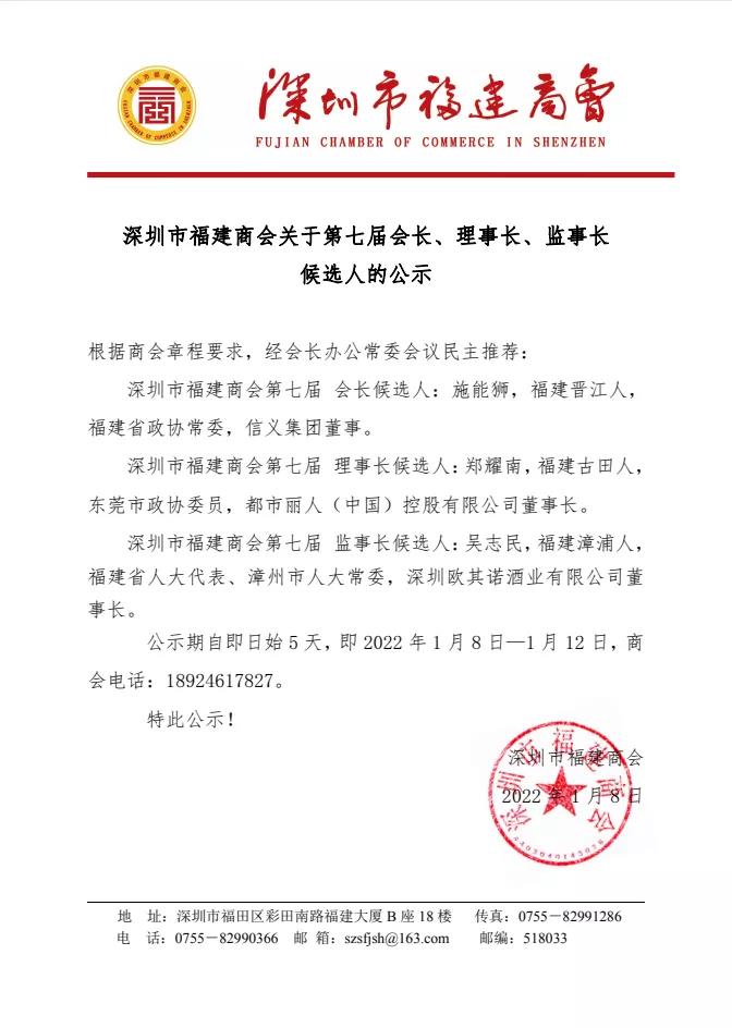 深圳市福建商会关于第七届会长、理事长、监事长候选人的公示