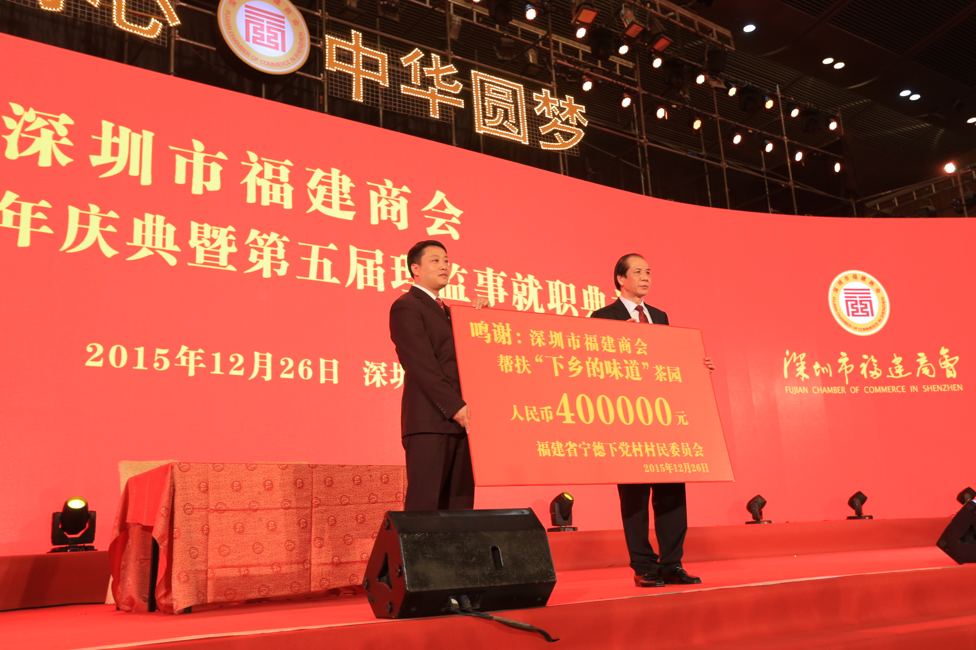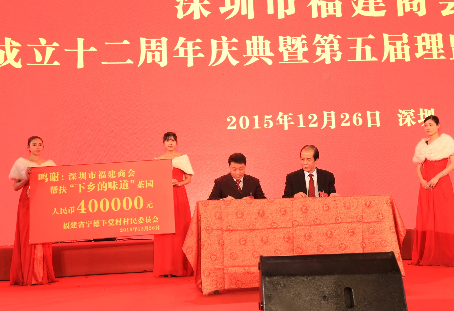 大会还举行了《深圳市福建商会结对帮扶福建省寿宁县下党村精准扶贫签约仪式》,商会挂钩帮扶该村,并定制该村茶园。