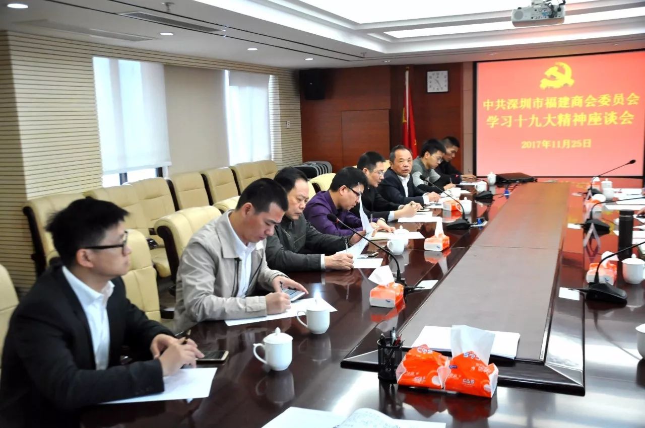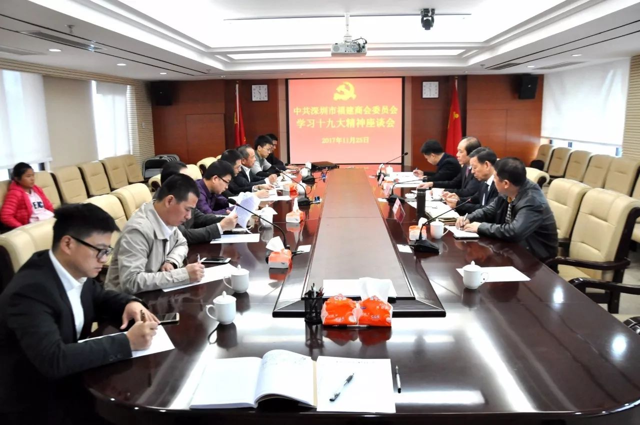 11月25日上午,深圳市福建商会党委组织召开了学习十九大精神座谈会,党委书记黄祖仁、副书记纪委书记陈加明、副书记陈明旗以及龙岩商会、三明商会、莆田商会、漳州商会、党委办等支部书记、党员参加了座谈会。