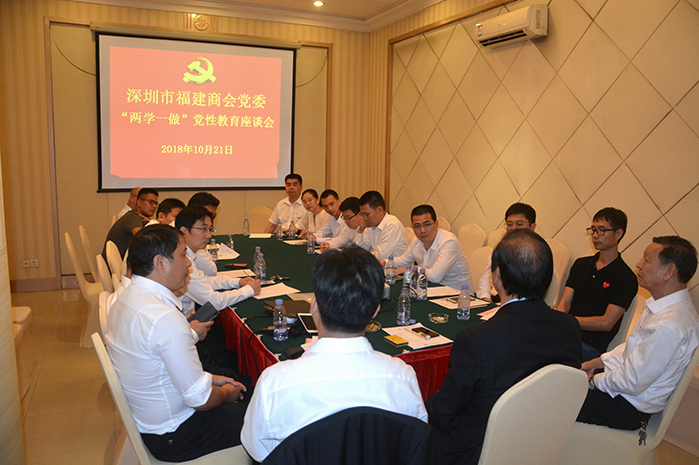 2018年10月21日,在商会五届四次会员大会召开前夕,深圳市福建商会党委利用大会空隙时间,见缝插针,组织召开“两学一做”党性教育座谈会,党委书记黄祖仁,副书记纪委书记陈加明、副书记陈明旗等党委纪委委员及各支部书记近30人参加。