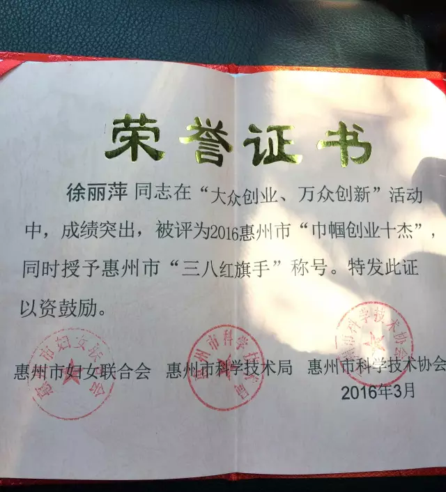 日前,我会徐丽萍常务副会长荣获惠州市“巾帼创业十杰”和“三八红旗手”称号。