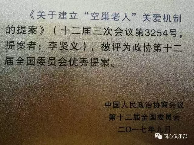 热烈祝贺全国政协委员、深圳市福建商会创会会长、信义集团董事局主席李贤义先生荣获政协第十二届全国委员会优秀提案荣誉!李贤义委员十二届三次会议第3254号提案《关于建立“空巢老人”关爱机制的提案》被评为政协第十二届全国委员会优秀提案!