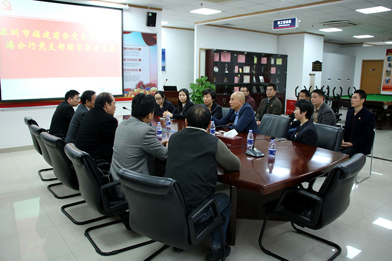 会后,深州市福建商会党委一行到交通银行前海分行党支部开展“联学联建”交流活动。交通银行前海分行行长、党支部书记李国辉,副行长封冬梅、赖俊英、胡芳,交行公司部总经理钟雪连等带领参观前海分行,并举行座谈会。
