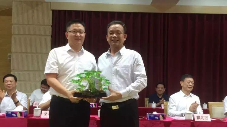 横岗街道党工委书记李坚向李贤义会长赠送尊师重教纪念品